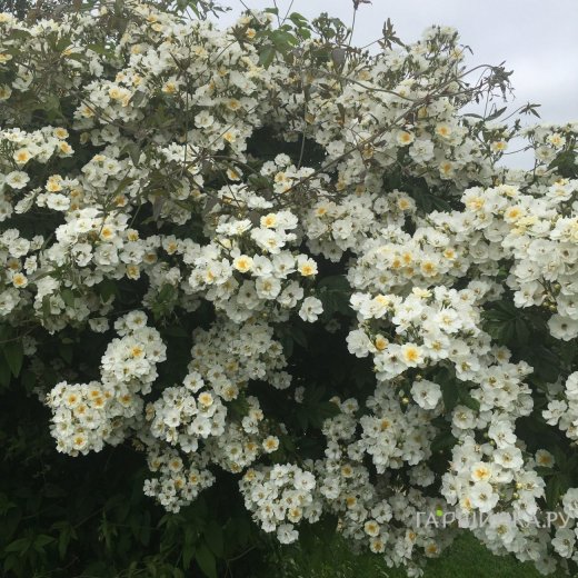 Роза Сегул, Мейян (лиц) - Одна из самых обильноцветущих плетистых роз. Высота достигает 300-400 см, ширина 300 см. Цветки около 3 см диаметром, белые с золотыми тычинками, полумахровые, с волнистыми лепестками. Распускаются из розовых бутонов в крупных прямостоячих кистях, по 30-50 штук, с ярким мускусным ароматом. Листва крупная, бледно-зеленая, сильные толстые побеги усеяны крупными шипами.