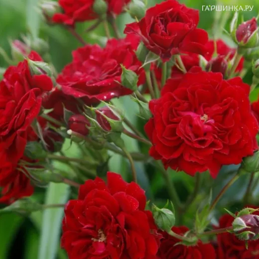 Цветки маленькие, диаметром до 4 см. Махровые, карминно-красные, в больших зонтиковидных соцветиях.