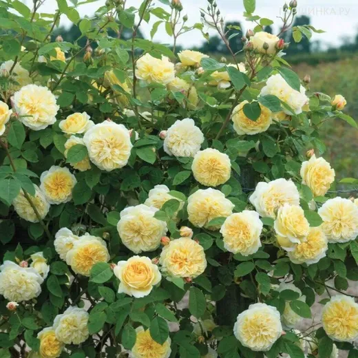 Роза Сирано де Бержерак плетистая, Топалович (лиц) - выведен от популярной плетистой розы Polka и отличается от нее только нежно-желтой окраской. Куст крепкий, выносливый. Цветки крупные, густомахровые с легким ароматом, в старинном стиле. Обильноцветущая роза с прекрасной устойчивостью к заболеваниям.