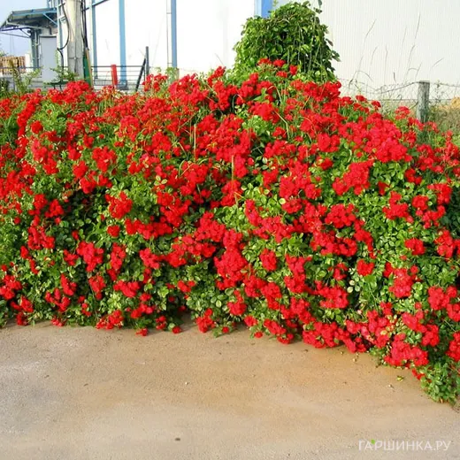 Описание сорта: куст имеет округлую, слегка поникающую форму с фонтанообразными побегами, покрытыми глянцевой тёмно-зелёной листвой. Высота взрослого растения составляет 100–150 см, ширина — 150–185 см. В период цветения (с начала лета до поздней осени) побеги усыпаны ярко-красными цветками с бархатистой текстурой и волнистыми лепестками. Цветки держатся долго: не осыпаются, а засыхают на кусте, не теряя декоративности.