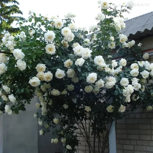 Роза Шнеевальцер плетистая, Топалович (лиц) - крупные цветки, по форме напоминающие чайно-гибридные розы. Едва раскрывшись, они очень бледно-лимонные, с жемчужно-розовым центром, позднее становятся чисто белыми. Появляются обычно по одному на длинных стеблях, иногда по 2-3. Побеги с цветами не жесткие, а изящно изгибаются в стороны, и цветки поникают, так что снизу их хорошо видно. Листва темная, устойчивая к заболеваниям, куст сильнорослый, ветвистый. Цветки густомахровые. Аромат: слабый.
