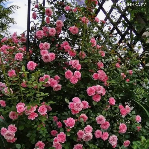 Роза Старлет Роуз Ева плетистая - Цветки насыщено-розовые замечательной помпонной формы, густомахровые, прочные, очень долго не отцветают. Листва полностью устойчивая к мучнистой росе, устойчивость к чёрной пятнистости - средняя. Куст пышный, высотой 150-200 см, с многочисленными побегами, которые непрерывно отрастают от основания куста, обеспечивая непрерывное цветение в течение всего лета.