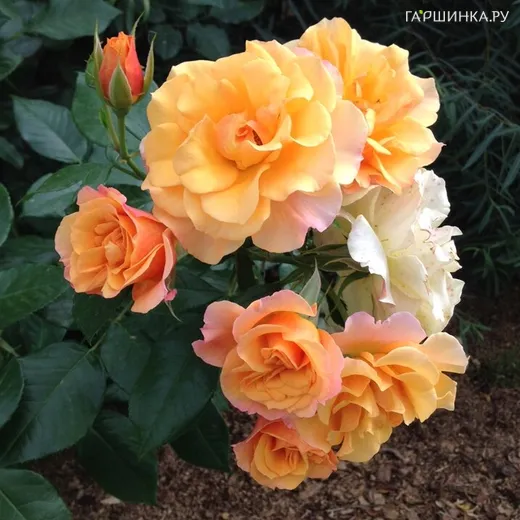Роза Текила кустарниковая, Top Roses - Одновременно на одном кусте розы Tequila можно видеть три цвета: бутон – ярко-оранжевый, распустившийся цветок – нежно-желтый с лососевым налетом, перед опадением – кремово-белый. Цветок махровый (27 – 30 лепестков). Куст ветвистый, прямостоячий, без шипов. Лист светло-зеленый, глянцевый, плотный. На одном цветоносе в период массового цветения насчитывается 10 – 15 цветков одновременно.