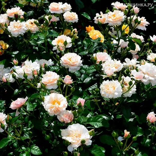 Посажена была поздно - в октябре. Зимовала под спанбондом. Не замерзла. Зацвела в первых числах июля. На ветке от 3 до 5 бутонов. Распускаются по очереди. Цветы кремово-розовые, сильно набиты нежными мягкими лепестками. Цветы очень красивы в момент распускания. Запах средний. Показывают желтую серединку из тычинок. Лепестки сами осыпаются при старении. Цветок живет дня 3-4.
