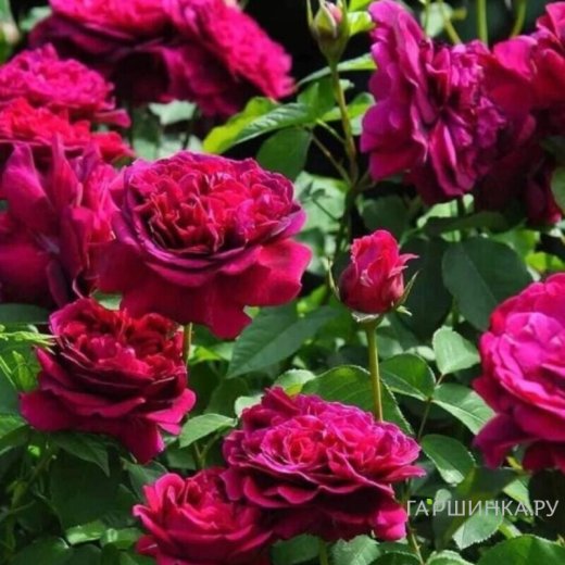 Роза Уильям Шекспир кустарниковая - отличается густомахровыми цветками насыщенного бархатного карминно-красного тона, который постепенно переходит в насыщенно-пурпурный. В начале цветки имеют форму глубокой вазы, затем они становятся более плоскими. Куст пряморослый, высотой до 105 см и диаметром до 75 см, и на каждом его побеге обилие цветков! Аромат интенсивный. Сорт устойчив к болезням.