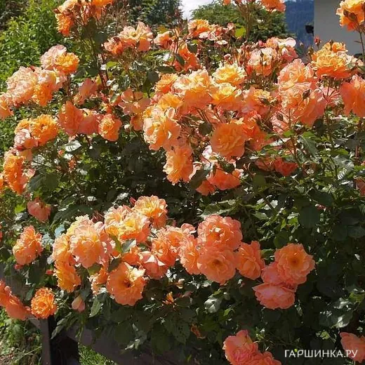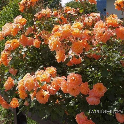 Роза Вестерленд кустарниковая, Топалович (лиц) отличается сильным ароматом, который чувствуется на расстоянии от куста. Это быстрорастущая, зимостойкая роза, которую можно использовать как кустовую либо как плетистую. Цветки очень яркие, смесь оранжевого, розового, абрикосового, и золотого – цвет меняется в зависимости от погоды. На солнце цветки словно светятся изнутри. Они крупные, полумахровые, с волнистыми лепестками, появляются в больших рыхлых кистях по 5-10 шт. Рано начинает цвести и цветет повторно до поздней осени. Каждая волна цветения очень длительная, так что куст редко стоит без цветов. Листва удлиненная, темная, устойчива к заболеваниям и хорошо оттеняет яркие цветки. Куст сильнорослый, прямостоячий, хорошо разветвленный и довольно колючий.