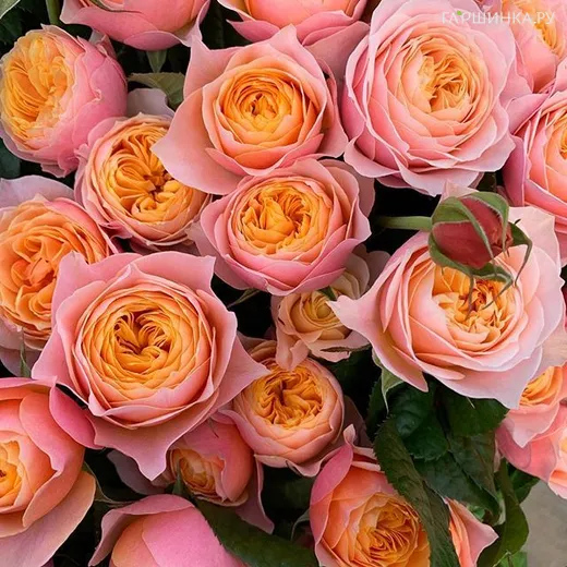 Бутон пионовидной формы имеет густомахровые лепестки в количестве 38-45 штук. Особый интерес представляет окрас цветков, который может варьироваться от песочного или оранжевого до кораллового, персикового и золотистого. Аромат довольно приятный, но очень легкий и практически незаметный.