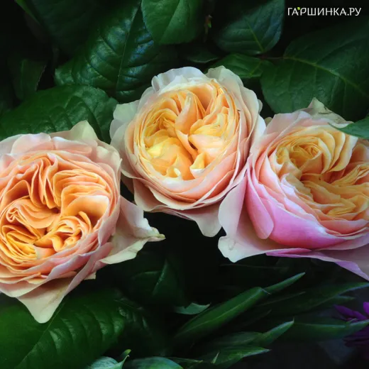 Цветки диаметром до 10 см, густомахровые, медово-оранжевые с розовыми внешними лепестками, одиночные. Листва зелёная, глянцевая.