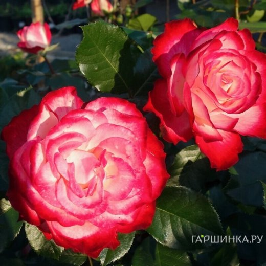 Роза Юбилей Санкт Петербурга флорибунда - В полуроспуске бело-кремовые лепестки окантованы нежной малиновой каймой, которая по мере раскрытия цветка расширяется, а ее интенсивность усиливается до вишневой. Цветки крупные, махровые, долго сохраняют прекрасную форму. Куст с плотной матовой листвой, выглядят опрятно в любое время. Прекрасная роза для небольших групп и массивов, в сложных посадках можно использовать как переход внутри красной гаммы.