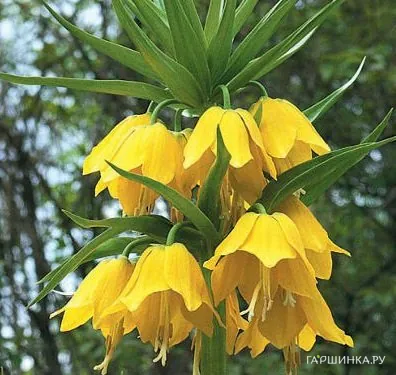 Цветущее растение рябчика императорского Lutea, действительно напоминает корону – шесть крупных цветков, увенчанных венцом ярких зеленых листьев. Лепестки рябчика Lutea словно отлиты из жёлтого золота. Рябчик императорский Lutea достигает в высоту 90- 120 см. Цветение: апрель-май. Зона зимостойкости: 5 (-29 С)