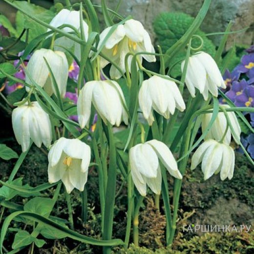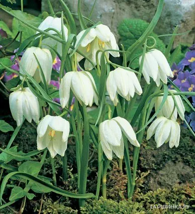 Рябчик малый Meleagris Alba. Белоцветковая форма, белые пестрины сливаются с белым фоном околоцветника, лишь возле нектарников располагается зеленое пятно. Период цветения рябчика малого Meleagris Alba май-июнь, высота до 30 см. Зона зимостойкости: 3 ( -39 С)