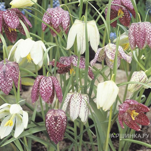 Рябчик малый Meleagris. Группа шахматных рябчиков – представляет собой очаровательное зрелище, темный шахматный цветок перекликаясь с белым создает удачный дуэт. Цветок рябчика Meleagris, как правило, один, довольно крупный, белый или с выраженным "шахматным" рисунком на лепестках, темно-пурпурных и бело-пурпурных тонов. Диаметр цветка 4-5 см, высота рябчика 25-30 см. Продолжительность цветения 2-3 недели. Период цветения рябчика малого Meleagris май-июнь. Зона зимостойкости: 3 ( -39 С)