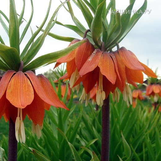 Рябчик Рубра императорский - цветки эффектные красные с кирпичным оттенком и пунцовыми штрихами внутри. Собраны на верхушке цветоноса по 6-10 шт. Лепестки с чуть заметными жилками, достигают размеров 7 cм * 4 cм. Диаметр цветов может достигать 10 см и больше. Чем больше развивается луковица, тем выше вырастает цветонос и тем крупнее формируются цветы. Цветонос, как и у всех императорских рябчиков, тёмный и очень прочный. Его высота около 1 м. Зацветает в мае, цветение длится до 2-х недель. Конечно же, лучше всего он смотрится на задних планах цветника или на фоне контрастных зелёных хвойных изгородей.