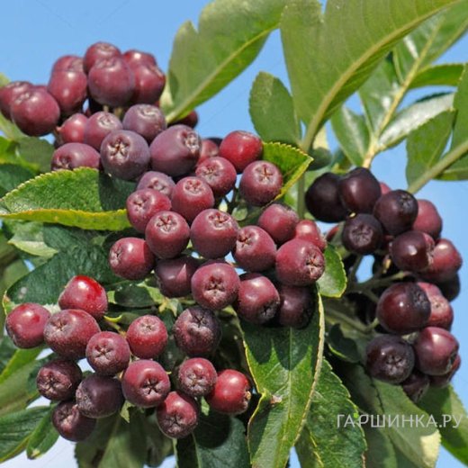 Рябина Бурка - Низкорослая рябина вырастает до 2 м, формирует компактную крону округлой формы, образованную среднераскидистыми ветками. Листья перисто-рассеченные, темно-зеленого цвета. Цветет в конце весны собранными в щитковые соцветия мелкими ароматными пятилопастными цветками белого окраса с тонкими розоватыми тычинками. В конце лета культура вступает в период плодоношения, который продолжается почти до зимы. На дереве образуются слегка сплющенные округлые ягоды весом до 1,5 г, по мере созревания приобретающие темно-бордовый или буроватый оттенок. Кожица тонкая, мякоть насыщенного темного цвета, сочная. На вкус ягоды кисло-сладкие с характерной для рябины терпкой нотой. Лучше всего плоды этого сорта подходят для варенья и компотов, приготовления джемов, начинок для выпечки и других десертов.