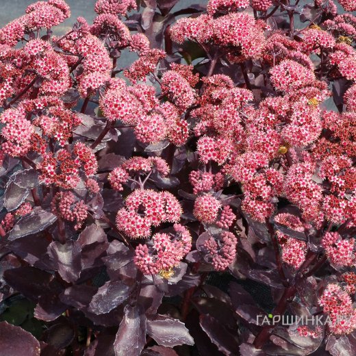 Очиток (седум) Черри Траффл - это травянистое суккулентное низкорослое растение семейства Толстянковые. Высота 40см, ширина до 60см. Весной покрытый многочисленными пурпурными, красными и коричневыми листиками, в летнее время он полностью окрашивается в глубокий шоколадный цвет. На концах побегов распускаются щитковидные соцветия с розовыми цветками.