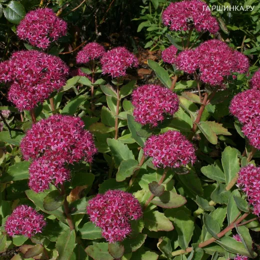 Очиток (седум) Карл - это травянистое суккулентное низкорослое растение семейства Толстянковые. Высотой 30-35 см. Голубовато-зеленые толстые овальные листья с зубчатыми краями, стебли прямостоячие, красноватые. Мелкие ярко-розовые цветки собраны в плотные щитковидные соцветия диаметром от 7 до 15 см. Цветение в августе-октябре.