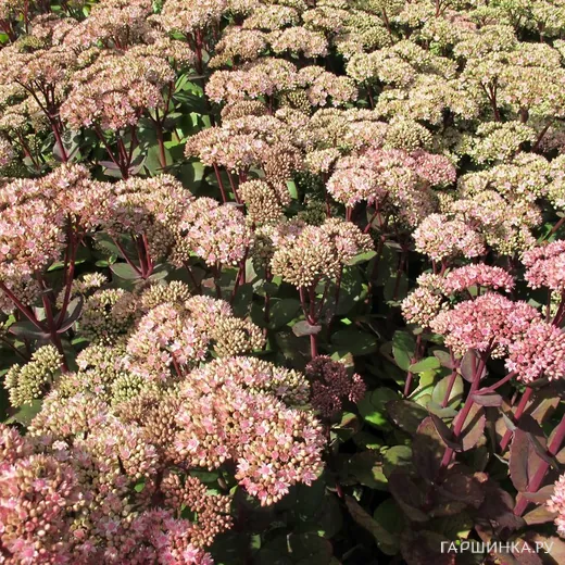 Очиток (седум) Матрона - это травянистое суккулентное низкорослое растение семейства Толстянковые. Высота 60-80 см. Темно-сизая листва на вишневых стеблях, розовые цветки в крупных щитках. Цветение: август-октябрь.