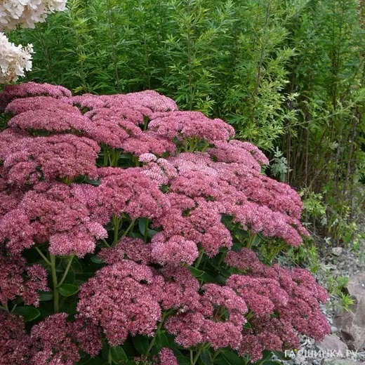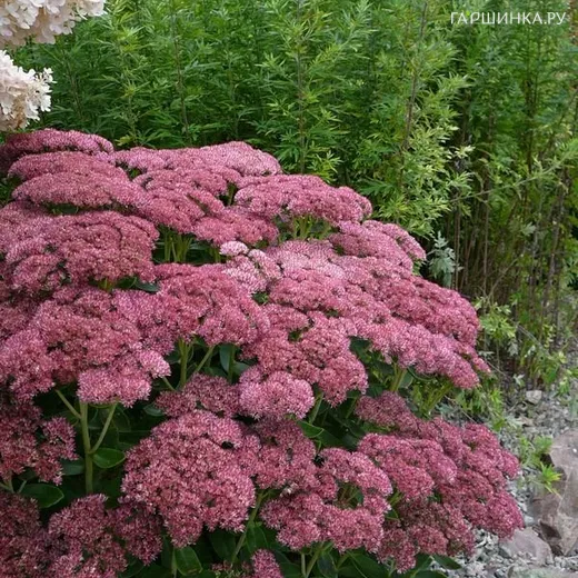 Очиток (седум) Бриллиант - это травянистое суккулентное низкорослое растение семейства Толстянковые. Высота: 50-60 см. Стебли толстые, прямостоячие, образуют плотный куст, соцветия плоские, собраны в полузонтики розово-брусничного цвета и достигают в диаметре 10-15 см. Побеги плотно покрыты сочными голубовато-зелеными зубчатыми листьями овальной формы. Цветение: август-октябрь.
