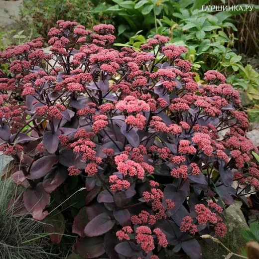 Очиток (седум) Ксенокс - это травянистое суккулентное низкорослое растение семейства Толстянковые. Стебли прямостоячие, одиночные или по нескольку, 30 - 60 см высотой, светло-зеленые. Листья растения довольно плотные и мясистые. Они имеют пурпурно-фиолетовый оттенок. Цветочки небольшие и собираются с зонтичные соцветия. Их цвет пурпурно-розовый. Период цветения начинается в июле и продолжается по середину осени.