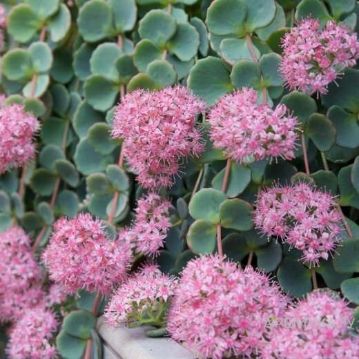Очиток (седум) Зибольда - это травянистое суккулентное низкорослое растение семейства Толстянковые. Стебли растения тонкие, лежачие, в высоту могут быть до 5-8 см., длина свисающих стеблей 25-30 см. Отличается светло-зелеными листьями, с голубоватым оттенком, и цветками розового цвета. Седум Зибольда имеет мясистые, округлые, тупозубчатые, по краю красноватые, покрытые восковым налетом листья. Цветки, появляющиеся в конце августа, мелкие, розовые, собраны в густые зонтики.