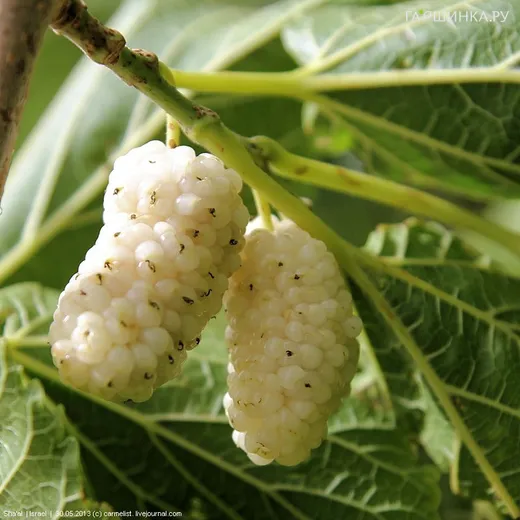 Шелковица белая - В культуре наиболее распространена и более устойчива к холоду шелковица белая (Morus alba) родом из Малой и Восточной Азии. Это быстрорастущее высокое (до 20 м) дерево-долгожитель (в благоприятных условиях роста живёт 150 и более лет) с густой шаровидной или раскидистой кроной. Листья на одном дереве растут разнообразной конфигурации (от широкоовальных до рассечённо- лопастных, длиной до 15 см); летом они тёмно-зеленые, а осенью жёлтые. Ягоды (размером до 3 см) сахаристые, белые или тёмно-фиолетовые. Этот вид выдерживает существенные морозы (до - 30 градусов), а при подмерзании молодых ветвей после их обрезки быстро отрастает и восстанавливает плодоношение.