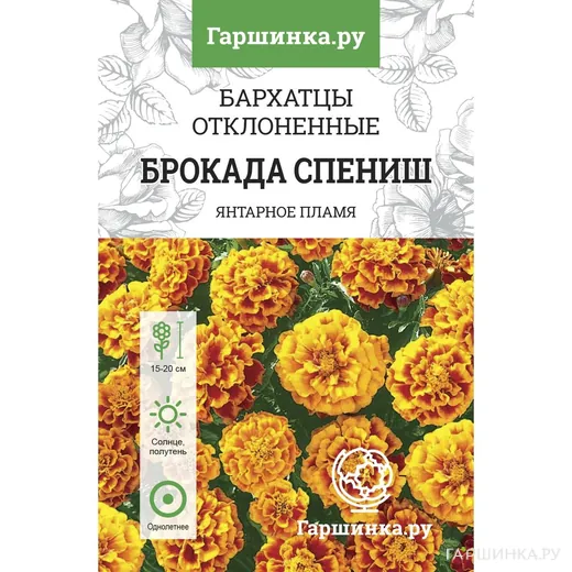 Бархатцы Брокад Спэниш откл. махровые - эффектный, низкорослый однолетник. Куст густоветвистый, шаровидный 0,2 м. Размножается семенами, которые высаживают в открытый грунт, при температуре почвы +17-18 °C, всходы появятся на 7- 14 день, заделывать семена рекомендуется на глубину 0,5 см. Возможно выращивание через рассаду, высевать семена нужно в конце апреля, рассада в открытый грунт высаживается в мае, на расстоянии 15-20 см, легкое восстановление самосевом. Соцветие махровое, гвоздиковидное, густое, цветок крупный, красно-желто-оранжевый, устойчив к дождю. Цветение обильное, продолжается до наступления заморозков. Используется для украшения балконов, выращивается на клумбах и в рабатках.