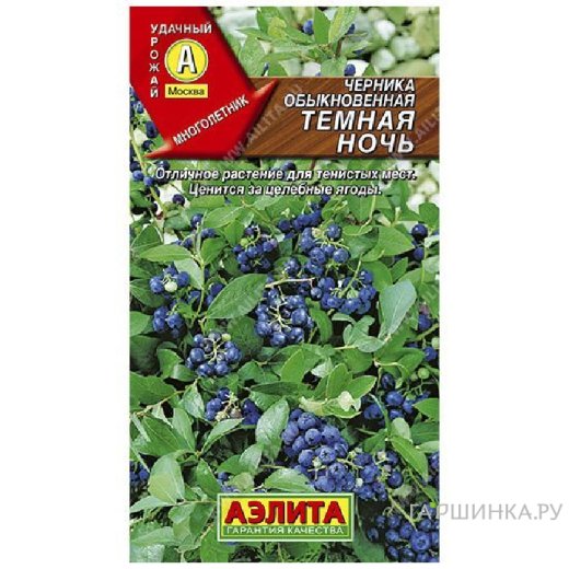 Черника Темная ночь 0,01гр ЦП - Долговечный кустарничек высотой 20-40 см. Ценится за целебные ягоды, богатые витаминами и другими биологически активными веществами. Цветет в мае, плодоносит в июле. Ягоды шаровидные, Ø8-12 мм, сладкие с кислинкой, сочные. Черника хорошо чувствует себя на влажных, кислых почвах (рН 4-5), под пологом деревьев (в идеале – хвойных). Чернику используют для озеленения тенистых мест - для создания ягодных полян среди деревьев, для обрамления берегов водоемов. Кусты хорошо поддаются стрижке, из них можно формировать низкие бордюры, внешне похожие на самшит.
