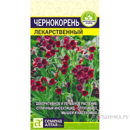 Чернокорень Лекарственный 0,1гр. ЦП - Двулетнее декоративное растение с ароматными цветками. Растение формирует куст высотой до 1 м, с сизо-зелеными густо опущенными листьями. Соцветие метельчатое, цветки воронковидные, темно-красные, иногда красно-синие. Обладает лекарственными свойствами. Корни и листья применяют как успокаивающее при болях, судорогах, кашле, ожогах, укусах змей. Прекрасный медонос. Отличный инсектицид - корни и листья используют для борьбы с грызунами. Подсохшие растения можно разложить на зиму в садовых домиках, у корней плодовых деревьев, погребах. Все части растения ядовиты! Отправления бывают при передозировке! Предпочитает солнечные участки. Для посадки подходит открытый участок с питательным хорошо дренированным грунтом. Хорошо растет на почвах со щелочной или нейтральной реакцией. Обладает высокой зимостойкостью, высевают в открытый грунт весной или под зиму, заглубляя семена в почву на 2-4 см по схеме 25х30 см. Необходимо систематически поливать посевы. При весеннем посеве всходы появляются через 3 недели. При необходимости их можно перенести на другое место, пересадку необходимо производить с земляным комом. Чернокорень неприхотлив: даже в засушливый жаркий период его поливают редко, плохо переносит застой влаги. Чтобы кусты не развалились и сохранили свою декоративность, длинные стебли подвязывают. В первый год жизни чернокорень не подкармливают, затем подкормки проводят ранней весной и в начале июня комплексным удобрением. Сбор листьев в качестве лекарственного сырья проводят в период цветения, в июле, сбор корней проводят осенью.