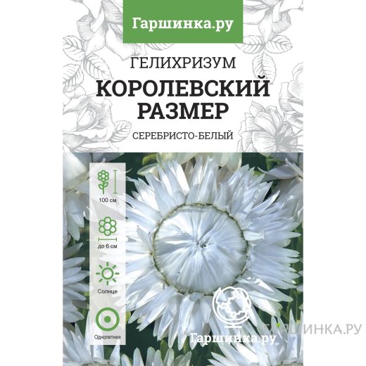 Гелихризум Королевский размер серебристо-белый - эффектный, высокорослый однолетник. Куст густоветвистый, прямостоячий 1,0 м. Размножается семенами, которые высаживают в открытый грунт, при температуре почвы +17-18 °C, всходы появятся на 10- 15 день, заделывать семена рекомендуется на глубину 0,5-0,9 см. Возможно выращивание через рассаду, высевать семена нужно в конце апреля, рассада в открытый грунт высаживается в мае, на расстоянии 25-30 см. Соцветие махровое, густое, цветок крупный, серебристо-белый. ,устойчив к дождю и неблагоприятным погодным условиям. Цветение обильное, продолжается до наступления заморозков. Используется для украшения балконов, выращивается на клумбах и в рабатках. Растение холодостойкое, неприхотливое. Используется как сухоцвет для зимних букетов.