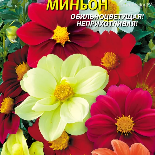 Георгина Миньон, смесь 0,15 г, Плазменные семена - Многолетнее травянистое растение, чаще культивируемое как однолетник из семейства Астровые. Образует многочисленные ветвистые стебли высотой 40-50 см. Стебли усыпаны немахровыми соцветиями, достигающими 8-9 см в диаметре. Соцветия яркие, розовой, красной, пурпурно-карминной, желтой, белой окраски. Обильно цветет до заморозков. Используется группами на клумбах, рабатках, в бордюрах. Культура тепло- и светолюбива.