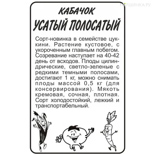 Раннеспелый (40-42 дня) сорт. Растение кустовое, с укороченным главным побегом. Плоды цилиндрические, светло-зеленые с редкими темными полосами, достигают 1 кг, можно снимать плоды массой 0,5 кг (для консервирования). Мякоть кремовая, сочная, плотная. Сорт холодостойкий, лежкий и транспортабельный.