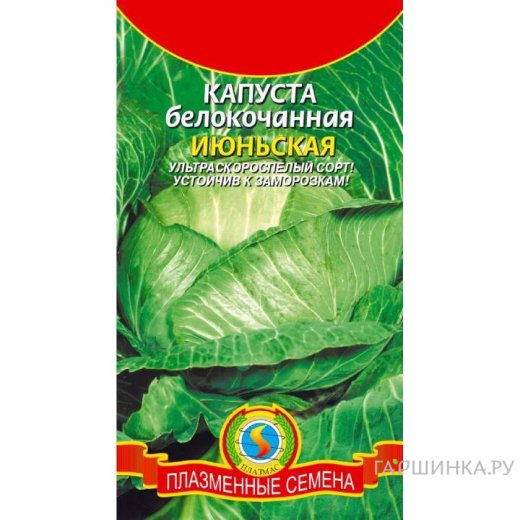 Семена Капуста Июньская 0,5гр ЦП - Ультраскороспелый сорт (от всходов до технической спелости 92-110 дней). Кочаны круглые или округло-плоские, массой 1,1-2,4кг, плотность хорошая. Лист у сорта нежный, с достаточным количеством витамина С. Созревание кочанов достаточно дружное. Вкусовые качества хорошие. Урожайность – 6кг/м². Сорт пластичный, относительно устойчив к повреждению капустной мухой и растрескиванию. Предназначен для употребления в свежем виде.
