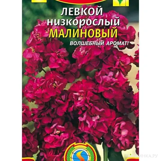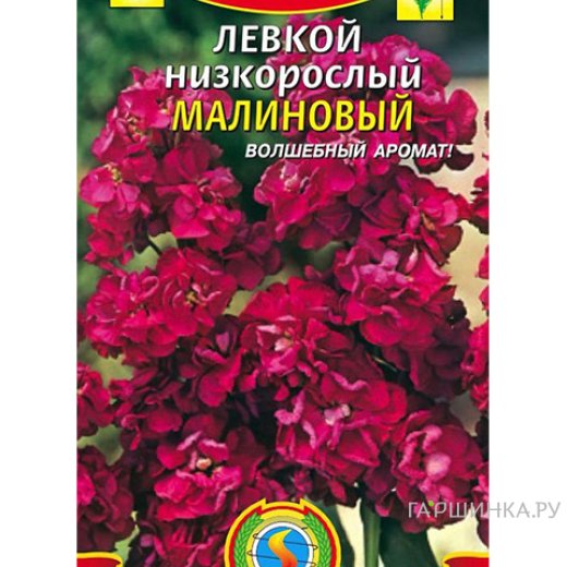 Левкой Малиновый низкорослый - эффектный травянистый, высокорослый однолетник, относится к семейству Крестоцветные. Куст прямостоящий, компактный, слабоветвящийся, стройные свечи 35 см, окраска цветка малиновая, с белым центром, хорошо подходят для срезки, свежесть соцветий сохраняется до 10 дней, хорошо подходит для украшения заднего плана цветника. Размножается семенами, высаживаются в открытый грунт, при температуре почвы +19-20 °C, всходы появятся на 10- 12 день, заделывать семена рекомендуется в глубину 0,3 см. Возможно выращивание через рассаду, высевать семена нужно в конце марта, в открытый грунт рассада высаживается в мае, на расстоянии 20-25 см.