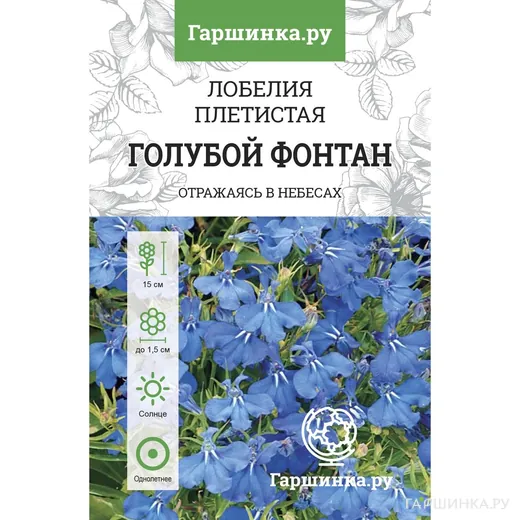 Лобелия Голубой фонтан - эффектный почвопокровный однолетник. Стебель тонкий, ветвистый 0,15 м, форма куста шаровидная. Лист мелкий, есть черешок. Размножается семенами, которые высаживают в открытый грунт, при температуре почвы +17-18 °C, всходы появятся на 7- 14 день, заделывать семена рекомендуется на глубину 0,3-0,5 см. Возможно выращивание через рассаду, высевать семена нужно в конце апреля, рассада в открытый грунт высаживается в мае, на расстоянии 15-20 см. Цветок мелкий, 2см, голубой. Цветение обильное, продолжается до наступления заморозков. Используется для вертикального озеленения.