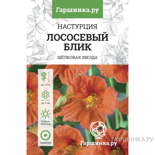 Семена Настурция Лососевый блик большая - эффектный полустелющийся однолетник. Побеги тонкие, ветвистые 1,5 м, форма куста шаровидная. Лист средний, есть черешок. Размножается семенами, которые высаживают в открытый грунт, при температуре почвы +17-18 °C, всходы появятся на 14- 20 день, заделывать семена рекомендуется на глубину 1,5-2,0 см. Возможно выращивание через рассаду, высевать семена нужно в конце апреля, рассада в открытый грунт высаживается в мае, на расстоянии 20-30 см. Цветок крупный, лососевый, шпорцы изогнутые, длинные. Цветение обильное, продолжается до наступления заморозков. Используется для вертикального озеленения.