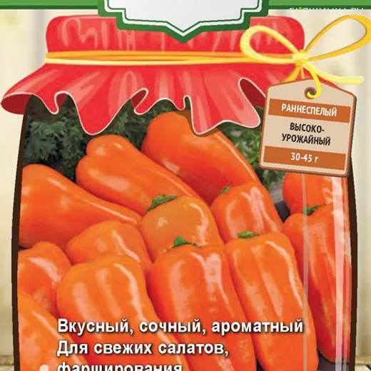 Оригинальный мелкоплодный сладкий перец для выращивания в открытом грунте, пленочных укрытиях, в горшках и контейнерах на балконе и лоджии. Раннеспелый сорт. Период от всходов до начала созревания 95-110 дней. Растение низкорослое, полуштамбовое, компактное. Плод конусовидной формы, гладкий, глянцевый, в технической спелости темно-зеленый, в биологической - желто-оранжевый. Масса плода 30-45 г, толщина стенки 4-4,5 мм. Плоды сочные, сладкие, с пикантным пряным ароматом. Отлично подходят для приготовления свежих салатов, фарширования и цельноплодного консервирования.