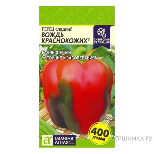 Перец Вождь Краснокожих сладкий ц/п 0,1 г, Семена Алтая - Раннеспелый крупноплодный сорт. Растение мощное. Куст штамбовый, 55-60 см. Плоды кубовидные, темные, мясистые, в технической спелости — зеленые, массой 156-400 г, толстостенные (6-8 мм), отличных вкусовых качеств. Сорт устойчив к заболеваниям. Можно выращивать после моркови, капусты, свеклы, бобовых (кроме фасоли) и тыквенных культур. Перец нельзя размещать рядом с огурцом. Выращивается рассадным способом. Для полу-чения рассады семена высевают в феврале в посевные ящики с почвенной смесью. Ящики, накрытые пленкой (стеклом), помещают в теплое место. Оптимальная температура для прорастания семян 23-25°С. В открытый грунт высаживают в начале июня.