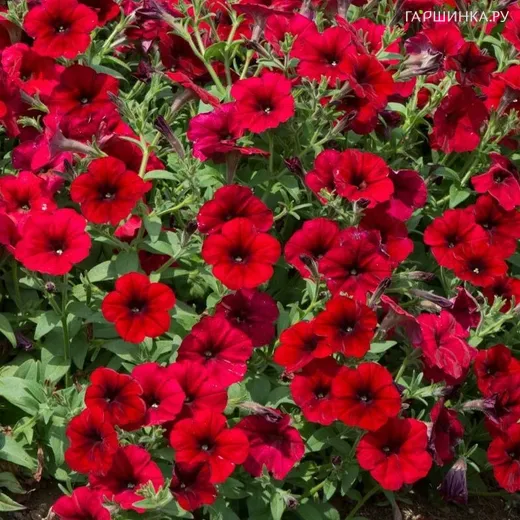 Петуния Тайфун F1 Ред Велюр- цветет весь сезон, образуя большое число мощных, твердых стеблей, длиной до 1,5 метра. Обладает необычной скоростью роста и мощью, формируя многие сотни цветков (размером около 5 см). Одно растение на клумбе разрастается на площади около 2 м2. При посадке на клумбах рекомендуется расстояние 70 см (минимально 35см), иначе растения будут тянуться вверх.