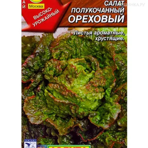 Салат Ореховый полукочанный 0,5 г - раннеспелый , полукочанный сорт. Вес одной розетки 250-300 грамм. Лист сочный, край красновато-розовой окраски, хрустящий, среднепузырчатый, край гофрированный, вкус нежный, пикантный, ореховый. Сорт устойчив к пожелтению и цветушности.