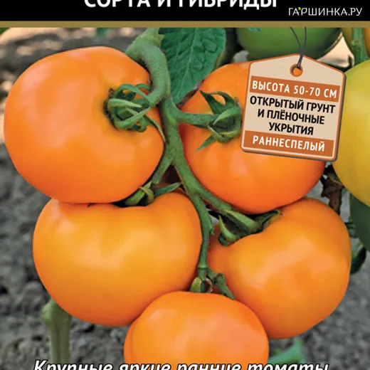 Для получения раннего урожая. Раннеспелый гибрид, от полных всходов до начала созревания плодов 95-98 дней. Растение детерминантное, высотой 50-70 см для выращивания в открытом грунте и под временными плёночными укрытиями. Гибрид устойчив к основным болезням томата. Плоды крупные, гладкие, яркого оранжево-персикового цвета, массой до 200 г, собраны в кисти по 2-3шт. Могут формировать «носик» на вершине. Вкусовые качества отличные. Плотные плоды не растрескиваются, пригодны для переработки на томатопродукты, необычайно хороши в свежем виде. Подходят для диетического питания.
