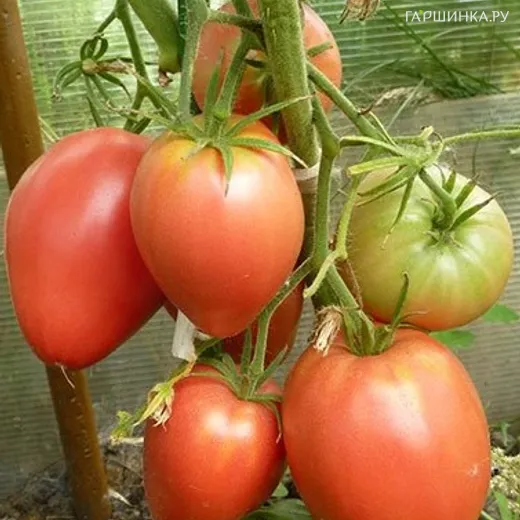 Плоды 300-600 г., сердцевидные, в стадии зрелости розово-малинового цвета, сладкие, сахаристые, малосемянные. Эти помидоры имеют салатное назначение, плохо переносят транспортировку и не могут долго хранится. Поэтому их лучше употреблять сразу в свежем виде.