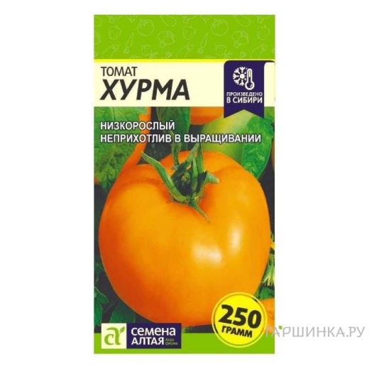 Томат Хурма 0,1гр ЦП - Среднеспелый сорт. Период от всходов до созревания 110-115 дней. Растение детерминантное (60-80 см), сильнооблиственное, слабоветвистое. Плоды плоскоокруглые, среднеребристые, оранжевого цвета, массой 240 г. Вкусовые качества свежих плодов отличные. Рекомендуется для выращивания в открытом грунте и необогреваемых теплицах. В марте семена высевают на слегка утрамбованный грунт, мульчируют торфом или почвенным слоем 1,0 см, поливают теплой водой через ситечко, накрывают пленкой и ставят в теплое (около 25°С) место. После появления всходов пленку снимают, рассаду размещают в светлом месте. В течение 5-7 суток температуру поддерживают на уровне 15-16°С, затем повышают до 20-22°С. В фазе 1-2 настоящих листьев рассаду пикируют. 60-65-дневную рассаду в фазе 6-7 настоящих листьев и хотя бы одной цветочной кисти высаживают в защищенный или открытый грунт.