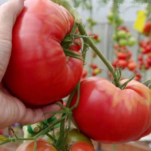 Плоды очень крупные, розово-красные, плоскоокруглые. Масса одного плода в среднем 450-550 г, однако могут встречаться экземпляры и свыше 700 г. Мякоть очень мясистая, приятной консистенции, вкусная. Из томатов этого сорта получаются великолепные соки и соусы, и, конечно же, они станут украшением стола в свежем виде.