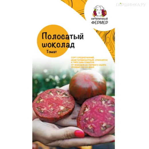 Томат Полосатый Шоколад (10шт), Нетипичный фермер - Сорт среднеранний, индетерминантный, относится к типу биф-томатов. От всходов до первого сбора урожая 105-110 дней. Первое соцветие образуется над 9 листом, последующие через 3 листа. Плоды многокамерные, плоскоокруглой формы, массой 250-350 г, с гладкой глянцевой поверхностью, окрашенной в густо оранжевый цвет с очень частыми тонкими зелёными полосками, штрихами и мазками. Вкус очень приятный, сладкий с насыщенным фруктовым ароматом. Мякоть плотная, красивая, семенные камеры не большие. Сорт толерантен к основному комплексу заболеваний томатов. Рекомендуется выращивать в 1-2 стебля по схеме посадки не более 4 растений/м2. Урожайность около 17 кг/м2.