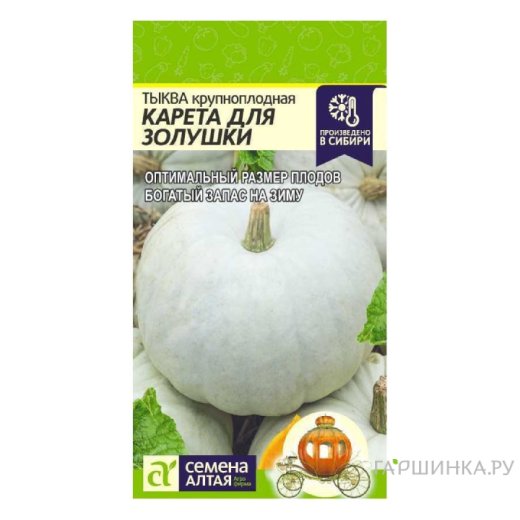 Семена Тыква Карета для Золушки 2гр ЦП - Растение длинноплетистое, засухоустойчивое. Сорт позднего срока созревания (120-140 дней). Плоды округло-плоские, сегментированные, серо-зеленые, крапчатые, массой 8-11 кг. Мякоть оранжевая, плотная, с высоким содержанием сахаров. Отличные транспортабельность и лежкость. Требовательна к плодородию почвы и освещению. Лучшие почвы — супесчаные и легкосуглинистые, слабокислые или нейтральные, с глубоким пахотным слоем. Отзывчива на внесение перегноя. Семена высевают в открытый грунт по 2-3 штуки в лунку, когда минует угроза заморозков. Глубина заделки семян 3-5 см, на легких почвах до 7 см. Для нормального вызревания на растении оставляют по 2-4 завязи, а плети прищипывают. Плоды убирают в полной спелости вместе с плодоножкой.