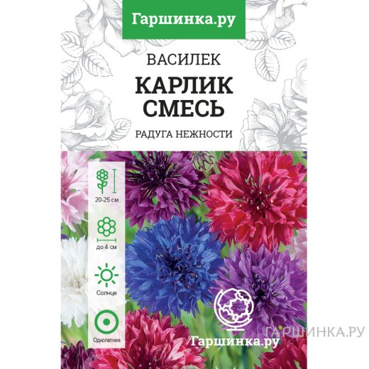 Василек Карлик, смесь пастельных оттенков - эффектный, низкорослый однолетник. Куст густоветвистый, прямостоячий 0,25 м. Размножается семенами, которые высаживают в открытый грунт, при температуре почвы +17-18 °C, всходы появятся на 14- 20 день, заделывать семена рекомендуется на глубину 0,3-0,5 см. Возможно выращивание через рассаду, высевать семена нужно в конце апреля, рассада в открытый грунт высаживается в мае, на расстоянии 15-20 см, легкое восстановление самосевом. Соцветие корзинка, 4 см, махровое, густое, цветок крупный, различный пастельных тонов, устойчив к дождю и неблагоприятным погодным условиям. Цветение обильное, продолжается до наступления заморозков. Используется для украшения балконов, выращивается на клумбах и в рабатках. Растение холодостойкое, неприхотливое.