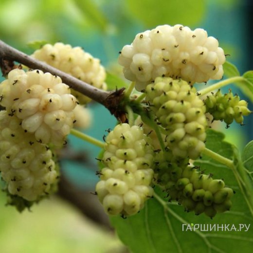 Шелковица Милановик белая - Быстро растущее дерево. Плоды крупные, длинной формы, сладкие и насыщенно приправленные белые плоды с плотной мякотью. Они созревают в течение длительного времени с середины июня до конца сентября, пик урожая приходится на начало июля. Высота взрослого растения, см 800.