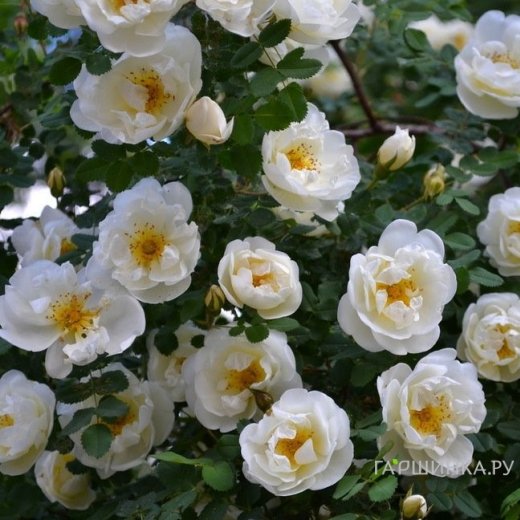 Шиповник белый - кустарник, высотой куста 0,75-2 м. Шипы различных размеров, тонкие, прямые, обычно внезапно расширенные при основании, самые крупные равны или длиннее самых крупных листочков. Обильно цветет простыми или махровыми цветками, кремово-белыми, иногда с едва уловимым розовым оттенком, в самом начале сезона; иногда - нерегулярно - до осени. Заметные тычинки. Листва мелкая, ажурная. Побеги густо усеяны длинными, похожими на иголки, шипами. Плоды сферические, почти черные, блестящие.