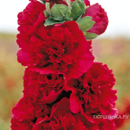Шток-роза Double Red махровая - Высота до 150 см. Цветение с июля по сентябрь. Является хорошим медоносом. Многолетний сорт махровой шток-розы с многоцветковыми соцветиями . Цветы темно-красные, махровые, слегка гофрированные. Размер цветка может достигать 15 см. Место — солнечное. Растению рекомендованы подкормки. Все шток-розы являются хорошим медоносом, поэтому их присутствие в Вашем саду ещё и полезно. Срезанные на бутонах цветы шток-розы хорошо стоят в срезке. Зимует без укрытия.
