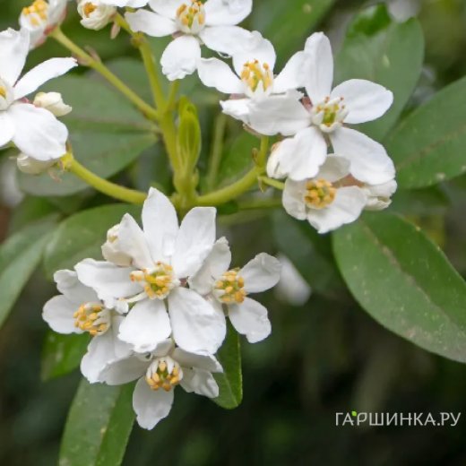 Шуазия тройчатая Мэджикал Аваланш - Редкое, удивительное растение. Похож по габитусу куста на рододендрон. Вечнозеленый, округлый кустарник до 1-1,5 м высотой с кожистыми, глянцевато-зелеными, ланцетными, пальчато расположенными листьями. Белые цветки в кистевых соцветиях и листва при растирании пахнут апельсином. Кадочное растение для светлого места, летом на воздухе; можно высадить в зимний сад.